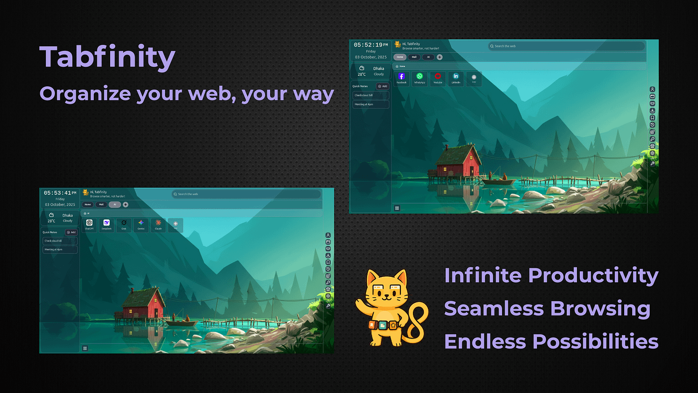 Tabfinity is a modern and intuitive Chrome extension designed to supercharge your bookmarks experience. Whether you're organizing your favorite websites, creating custom collections, or exploring built-in tools, Tabfinity makes browsing productive and fun.
